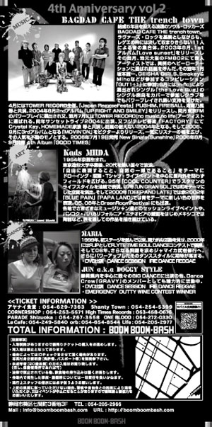 結成5年目を迎える浪速のソウル・ロッカーズBAGDAD CAFE THE trench town。ラヴァーズ・ロックを基調としながらも、レゲエの枠には決して 収まりきらない11人による音の集合体。2003年8月、 1stアルバム「Love sunset」をリリースしその当月、地元大阪の FM802にて新人アーティストでは、異例のヘビーローテーションに選ば れ話題を呼んだ。その翌年1月坂本龍一、GEISHA GIRLS、 Smokey& Mihoなどが参加するコンピレーション「GUT1+1」に参加。 3月には[m-flo]により 選出されシングル「the Love Bug」のシングル楽曲をカバーで参加しクラブ等でもパ ワープレイされ熱い支持を受けた。 4月にはTOWER RECORD主催、「Japan ReggaeFesta」PUSHIM、 FIREBALL、湘南乃風等と共演。2004年6月2ndアルバム「UP RIGHT AND SMILEY」をリリースし、同月東京FMのパワープレイに選出され又、翌月7月にはTOWER RECORD[no music,no life]アーティスト に選ばれる。同年サンセットライブ 2004に出演、又フジテレビ番組「FACTORY」にて Crystal Kay、HOMEMADE家族 等と共演し話題の耐えない2004 年となる。 そして2005、9月に3rdアルバ ムとなる「MOVIN'ON」をビクターよりリリース。一気にリスナー の幅を広げ、 その人気を不動のモノとする。